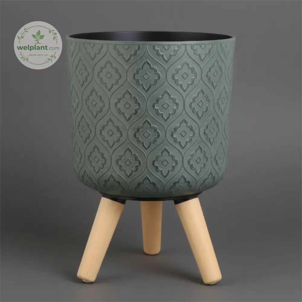 Texture & Material: Deep green embossed resin, Plastic pots with wooden legs, Forest green textured planters, Elevated patterned plant pots, Faux-carved garden pots.